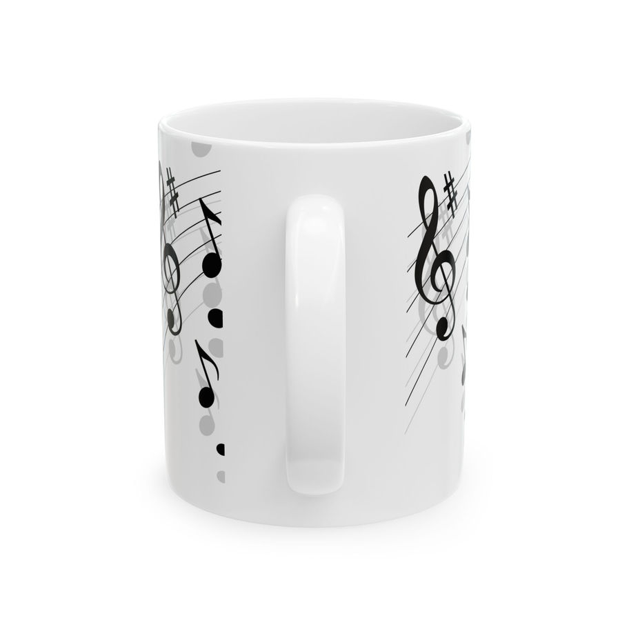 Reach for this music-themed ceramic mug when you need a steady rhythm to your morning. The glossy white surface makes the print sing — clear notes and bold lines against a bright background. It feels solid in your hand, the C-handle balancing warmth and weight as you sip. Whether you're sketching chords, cueing up a playlist, or taking a quiet break between practice sessions, this mug settles into the ritual: slow first sip, last encore. It fits on a studio desk beside a notepad, on a kitchen counter while you tune a guitar, or at the piano when you finally nail that passage. The colors stay true through washes and reheats, so the design keeps its energy day after day.